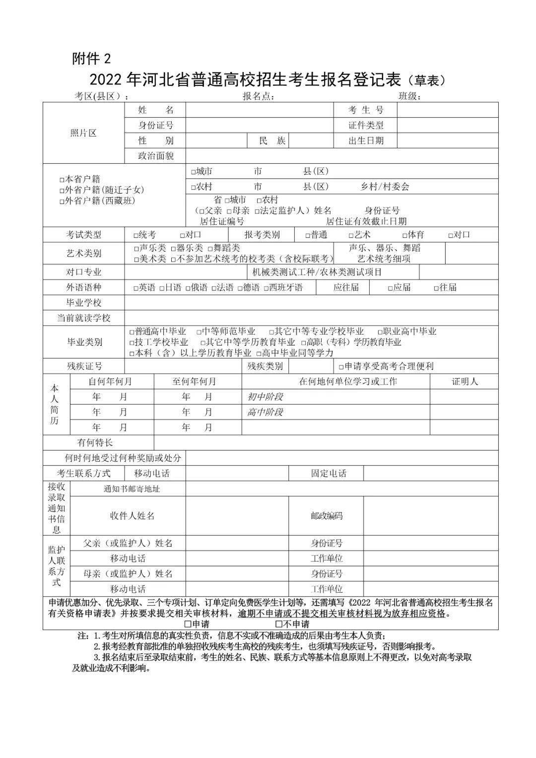 9、残疾证号项:残疾考生要填写残疾证号和残疾类别,申请享受2022年高考合理便利的残疾考生还须按报名点要求,如实填写《残疾人报考河北省普通高等学校招生全国统一考试合理便利申请表》,非残疾考生不填写残疾证号和残疾类别。