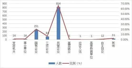 就业单位大多以企业为主,其他企业和国有企业分别占了63.97%和18.99%。