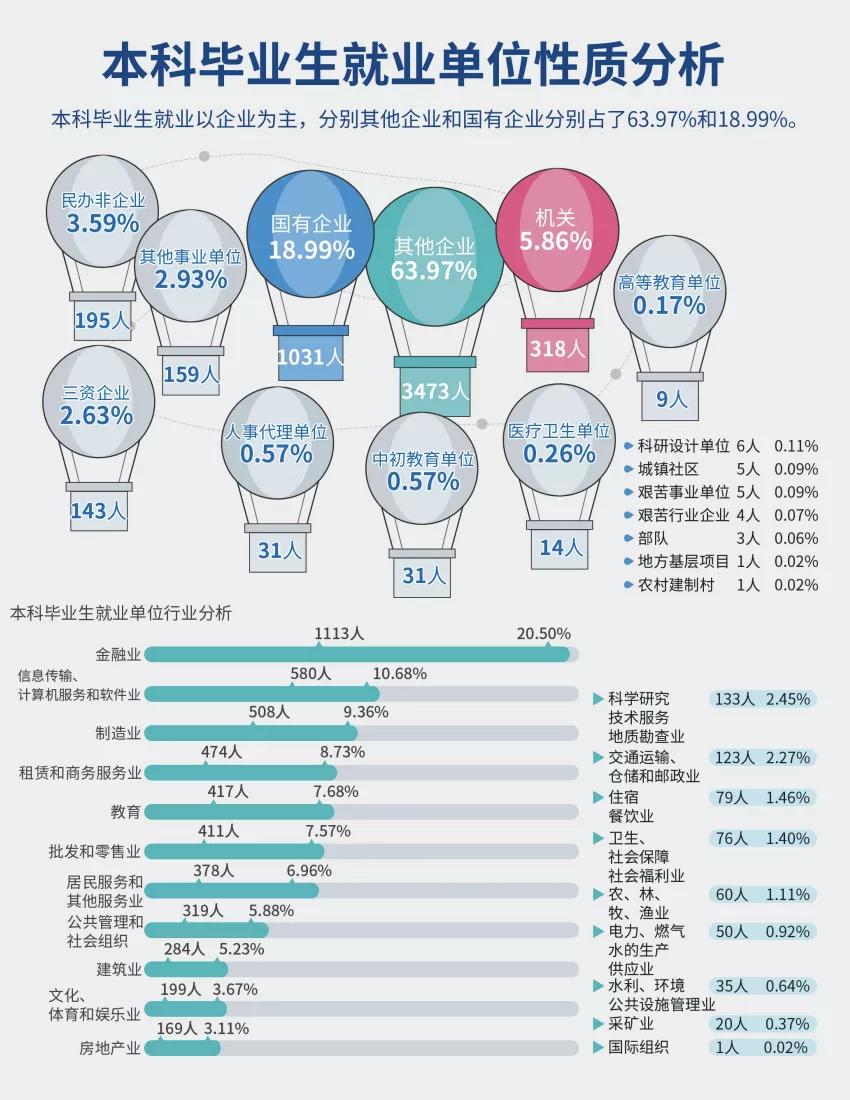 据2016年毕业生就业报告,本科毕业生初次就业率89.69%,并列排名全省高校第一位。从毕业生单位就业行业分布来看,大多集中在金融业、租赁和商务服务业以及制造业。