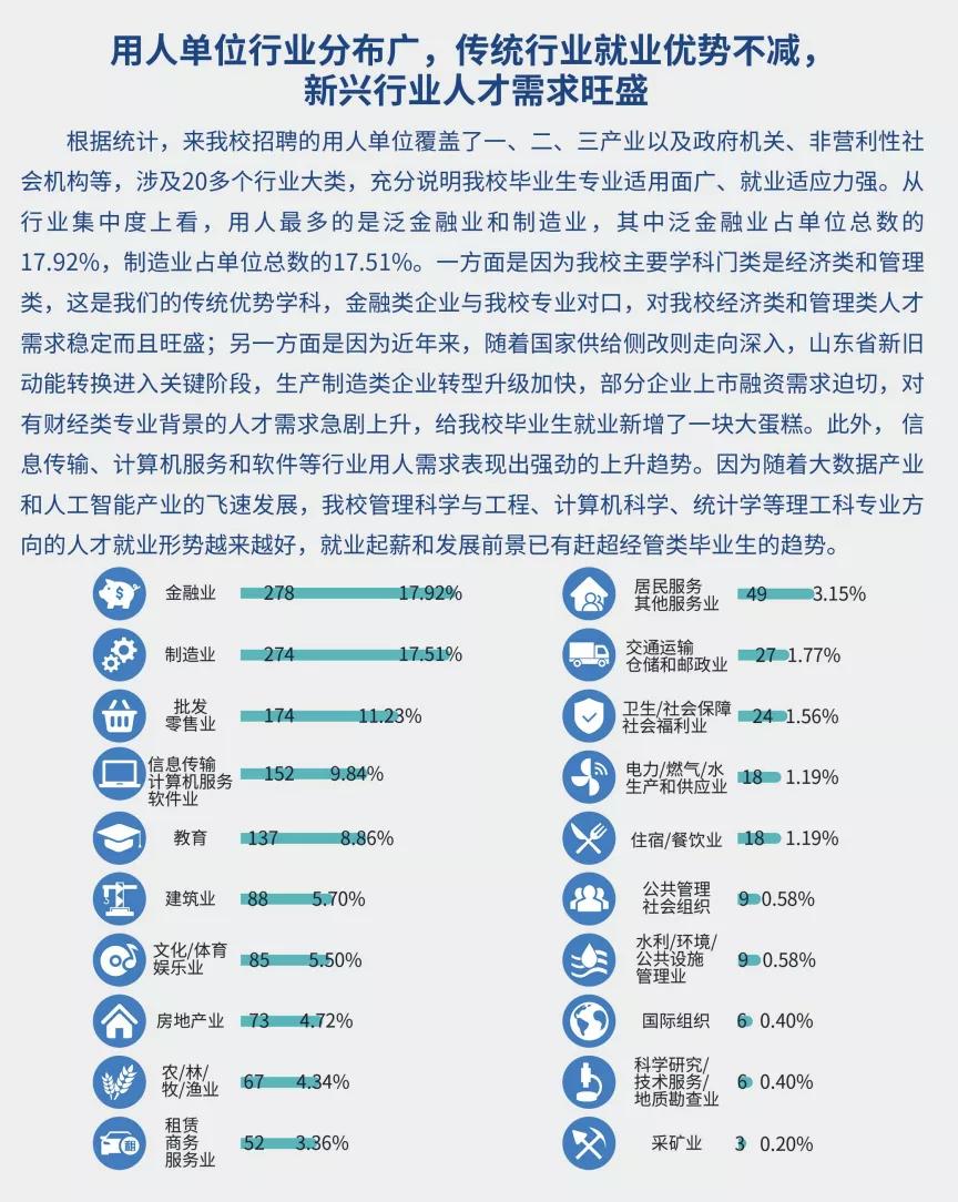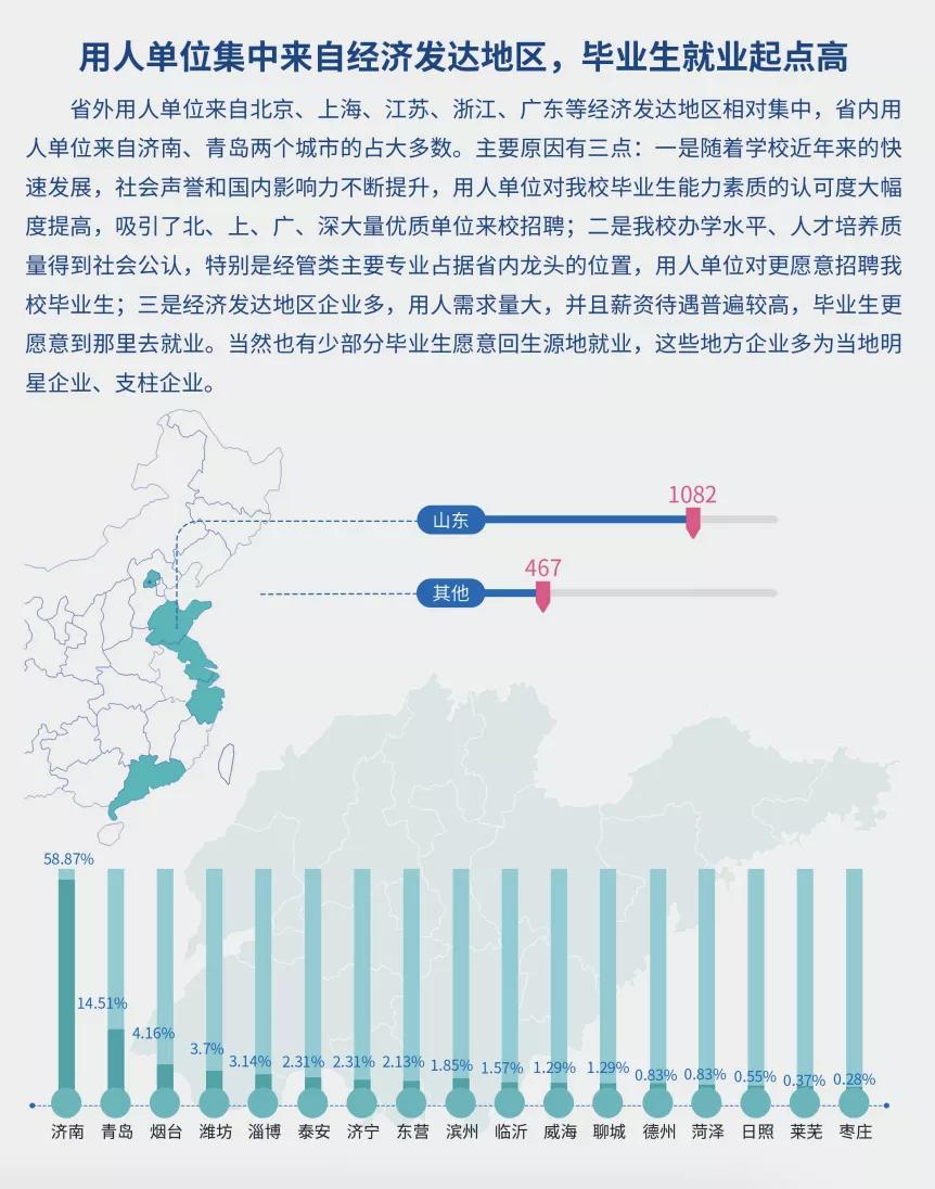 根据2018届毕业生就业质量报告,本科毕业生分布在18个学院,有17个学院就业率90%以上,且备受海内外用人单位青睐。在省内,毕业生遍布山东省财政、税收、银行、保险、证券、电商、物流、信息等经济管理各个行业。