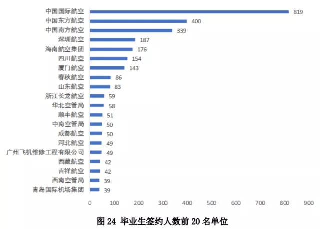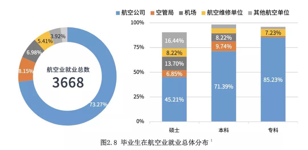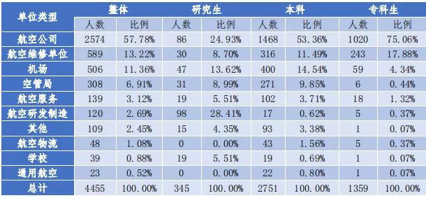 主要就业单位是航空公司,总体占比73.27%,其次是空管局、机场和航空维修单位。