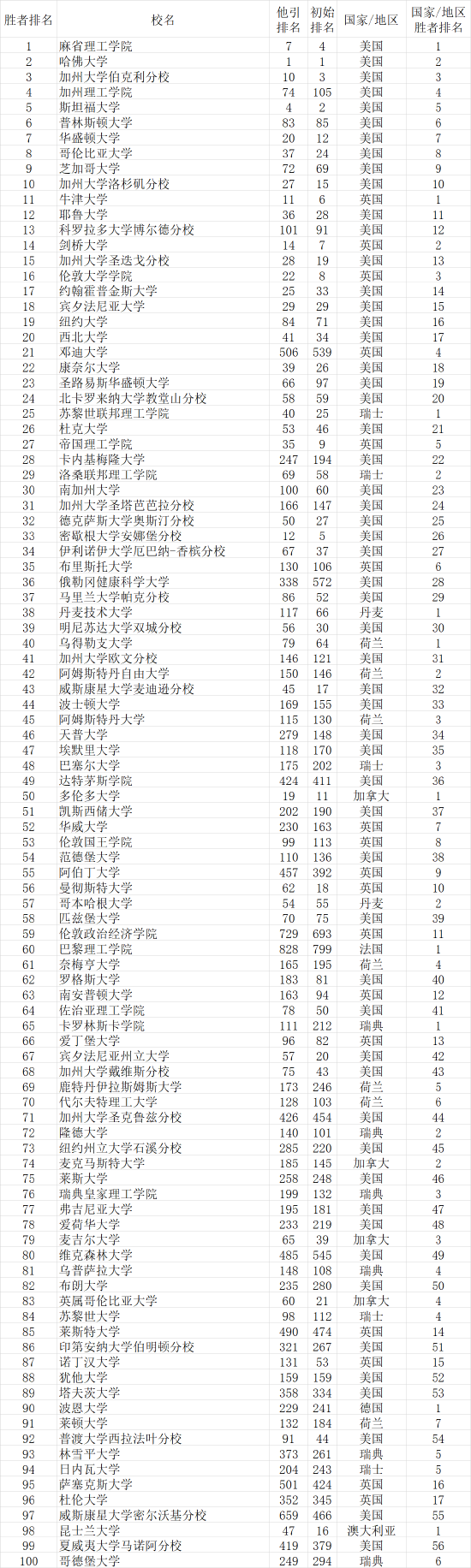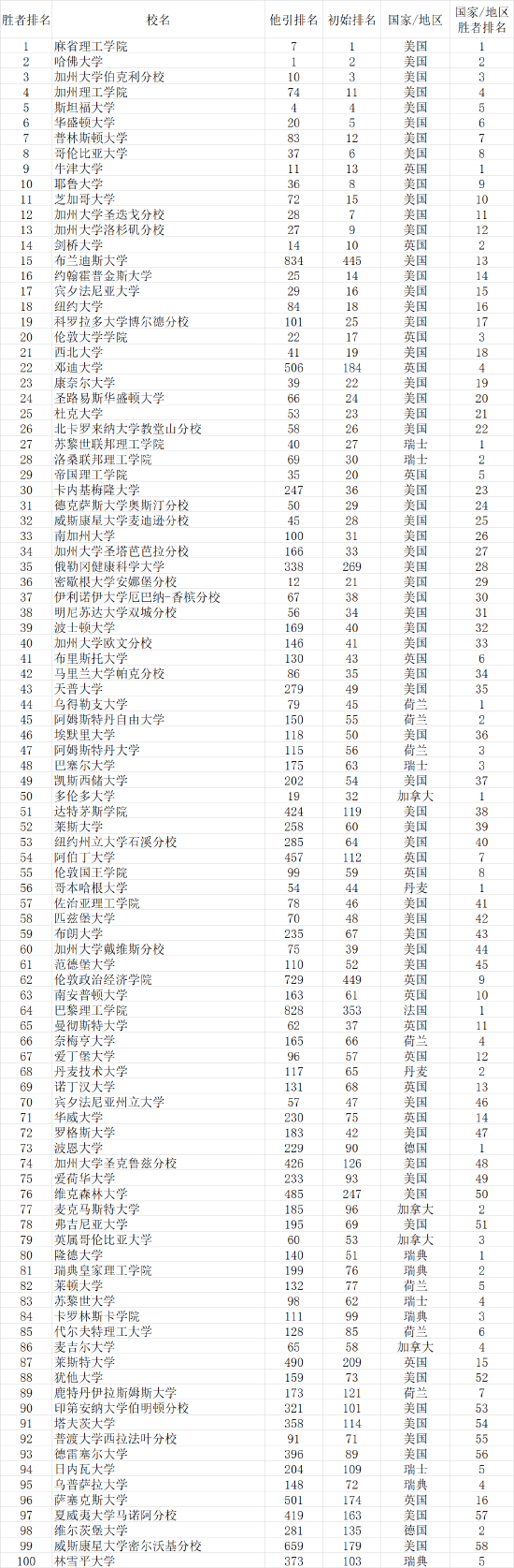 表中可见,即使他引排名或者初始排名靠后的大学,例如普林斯顿大学他引排名83、初始排名85,加州理工学院他引排名74、初始排名105,只要论文质量高,依照胜者在前评价原则,依然可以进入前10名。