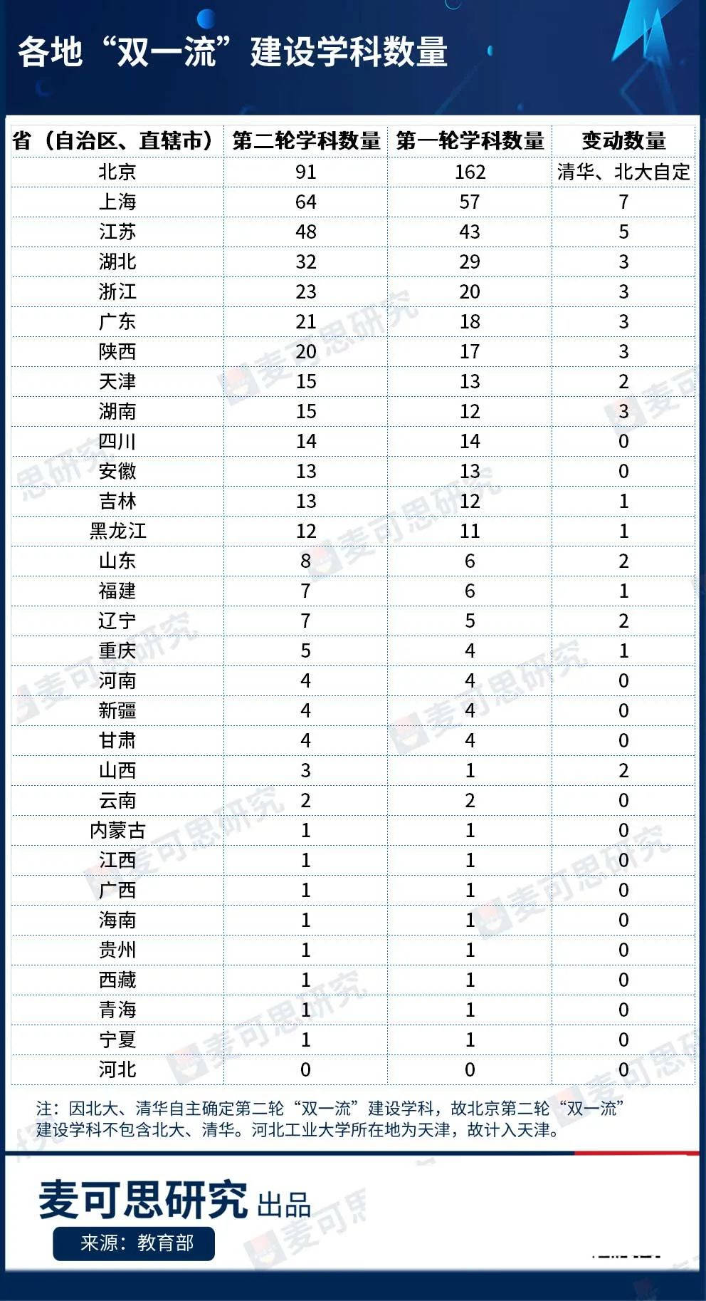 在新增建设学科数量上,上海新增最多(7个);其次为江苏,新增5个;湖北、浙江、广东、陕西、湖南各增加3个;天津、山东、辽宁、山西各增加2个;吉林、黑龙江、福建、重庆各增加1个。