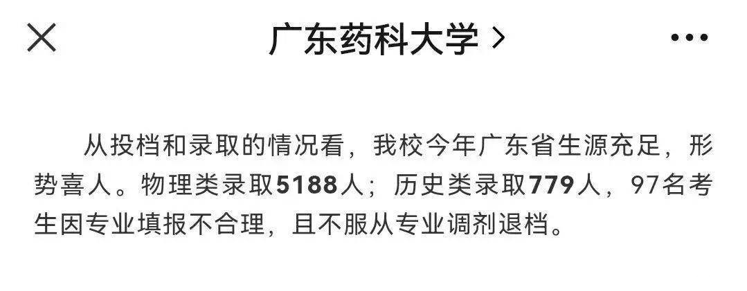 根据学校官微消息,广东药科大学2021年在广东历史类录取779人,97名考生因专业填报不合理,且不服从专业调剂退档。