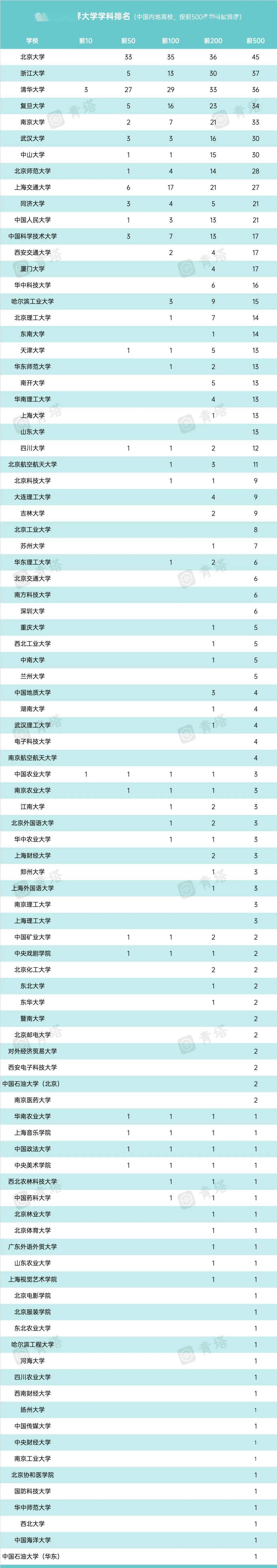 (统计仅含有中国内地高校上榜的50个学科;中国石油大学(华东) 、中国地质大学(武汉)和中国矿业大学(徐州)区分两地办学情况;以下按照 总上榜学科数排序):