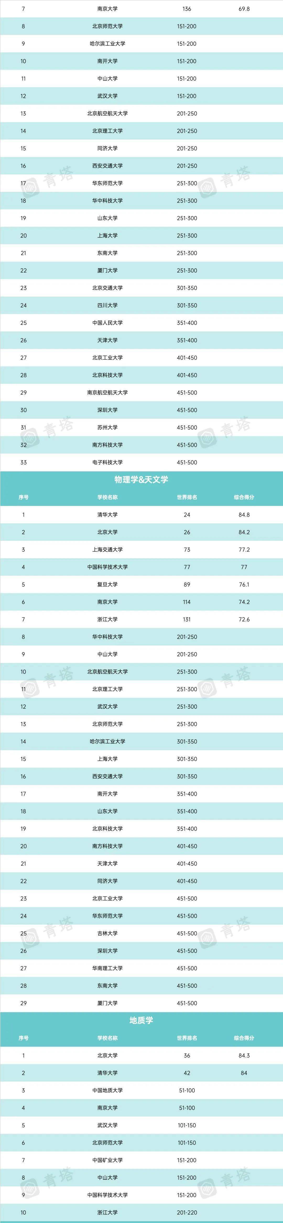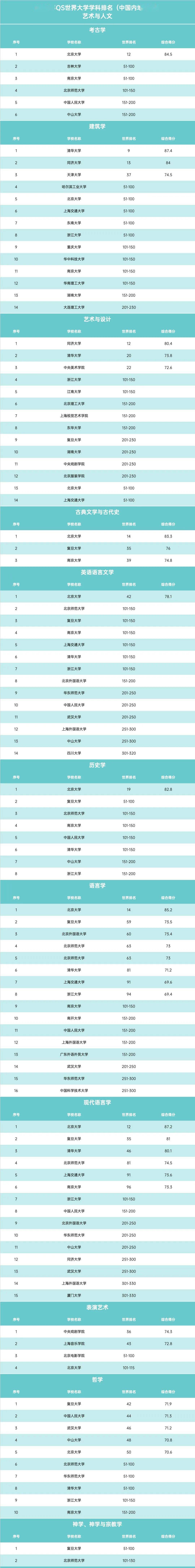 此外, 武汉大学、同济大学、中国科学技术大学各有3个学科 进入世界前50强, 南京大学有2个, 中山大学、北京师范大学(珠海校区)、中国人民大学、天津大学、四川大学、中国农业大学、南京农业大学、中国矿业大学(徐州)、中央戏剧学院、华南农业大学、上海音乐学院、中国政法大学、中央美术学院各1个, 高峰学科实力得到充分认可。