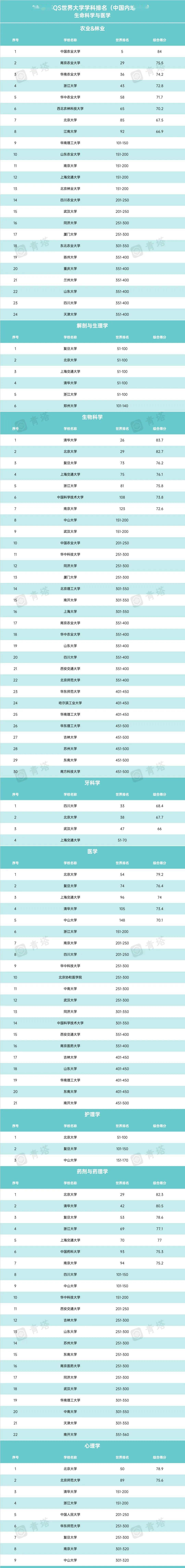 中国内地高校入选学科数和详细入选学科情况如下(以下按照高校进入 QS前100名学科数的顺序排序,仅展示前500名 ):