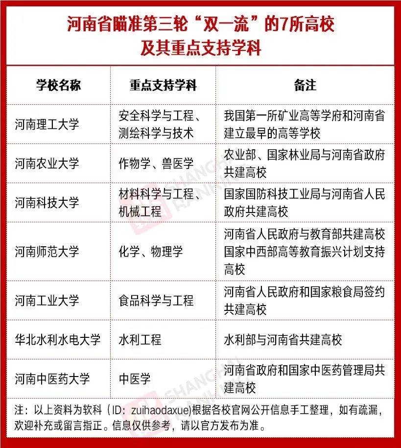 此外,河南省依照扶优扶强扶特的原则,遴选了河南理工大学、河南农业大学、河南科技大学、河南师范大学、河南工业大学、华北水利水电大学、河南中医药大学7所高校11个学科开展一流学科创建工作。投入55亿元创建资金,全力打造“双一流”后备军,力争2-3所高校、若干学科进入国家第三轮“双一流”建设行列。