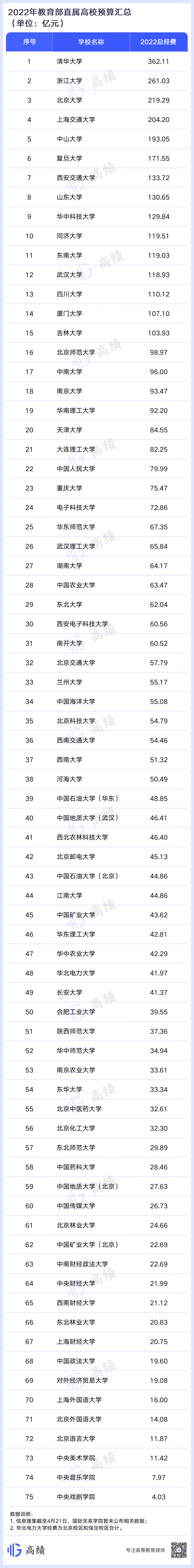 教育部直属高校2022年度部门预算中,共15所高校超过百亿。其中,清华大学最多,以362.11亿元遥遥领先;其次是浙江大学,为261.03亿元;北京大学则以219.29亿元位居第三;上海交通大学首次突破200亿,以204.20亿元位居第四。此外,经费超过百亿的高校还有中山大学、复旦大学、西安交通大学、山东大学、华中科技大学、同济大学、东南大学、武汉大学、四川大学、厦门大学、吉林大学等。