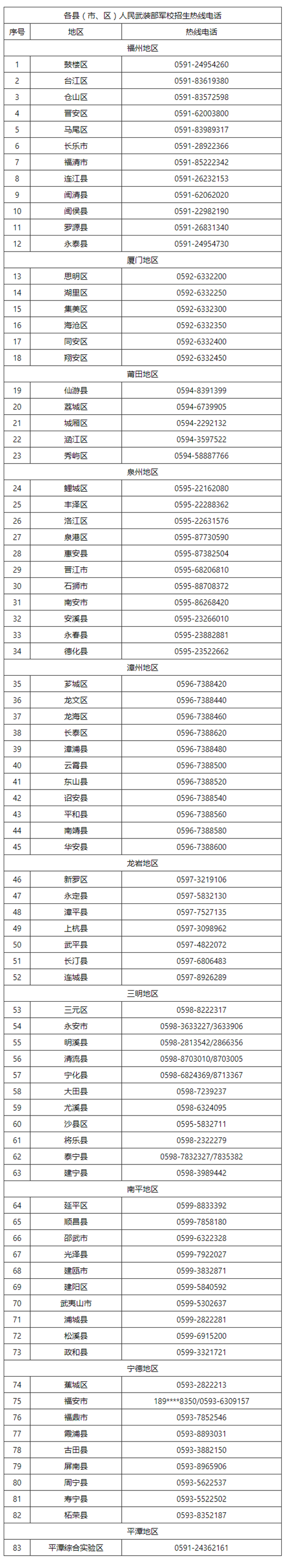 附:各县(市、区)人民武装部热线电话