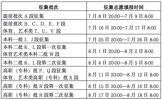 本科提前批A段、 B段、C段、D段、E段、F段、G段,本科一批H段、I段、J段,本科二批K段、L段,高职(专科)批P段、Q段,体育、艺术类本科一批(T段、U段、V段),体育、艺术类本科二批(W段)。