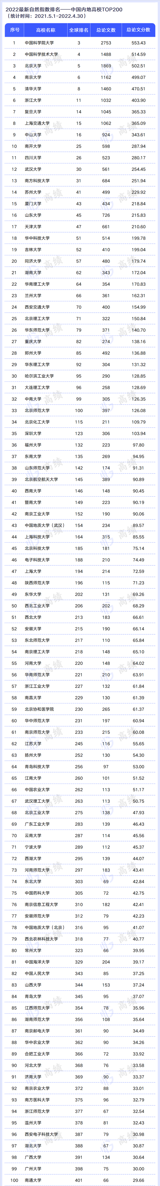 2022最新自然指数排名中国内地高校TOP200名单(2021.5.1-2022.4.30)如下: