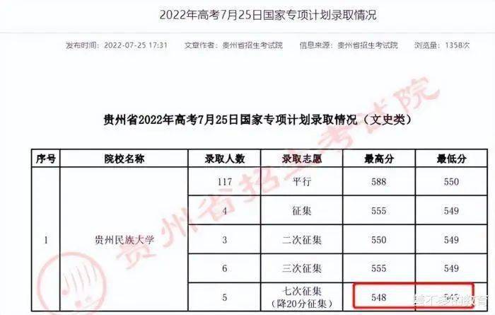 虽然贵州民族大学七次征集才招满人,最后还是降20分,不过笔者看了公布的征集投档数据,其实后面真正的投档线数据并不低,最高分有548分,最低分也有545分。