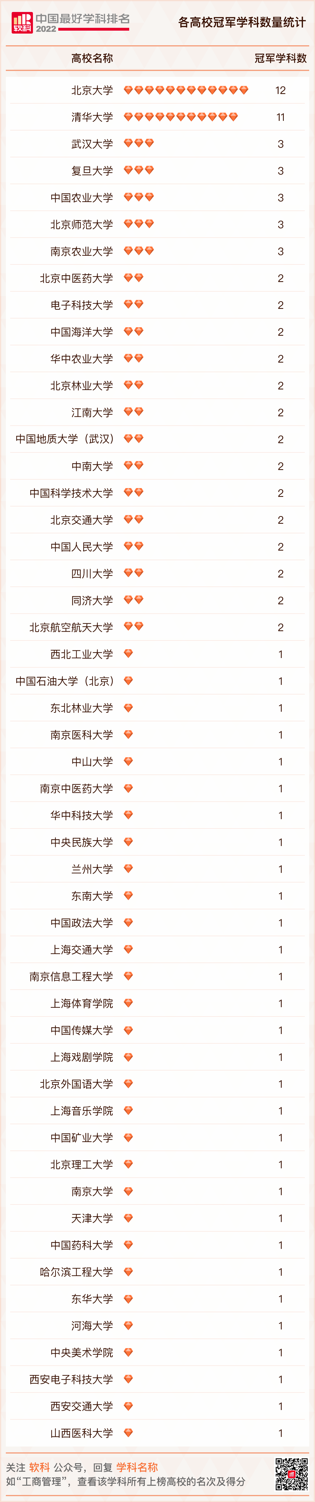 本次排名中,清北双雄可谓冠绝全国。自2022年初,教育部宣布,清华北大自主确定“双一流”建设学科,成为国内高校中断层领先的两所。从各高校冠军学科数量上看, 清华大学与 北京大学确不负全国顶尖之名,分别以12个和11个全国第一学科傲视全国! 武汉大学、复旦大学、中国农业大学、北京师范大学(珠海校区)、南京农业大学亦表现不俗,分别以3个王牌学科斩获桂冠!