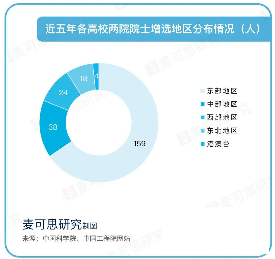 从地区分布上来看,近五年来东部地区高校增选两院院士数量最多,共计159位。其次是中部地区,共计38位。