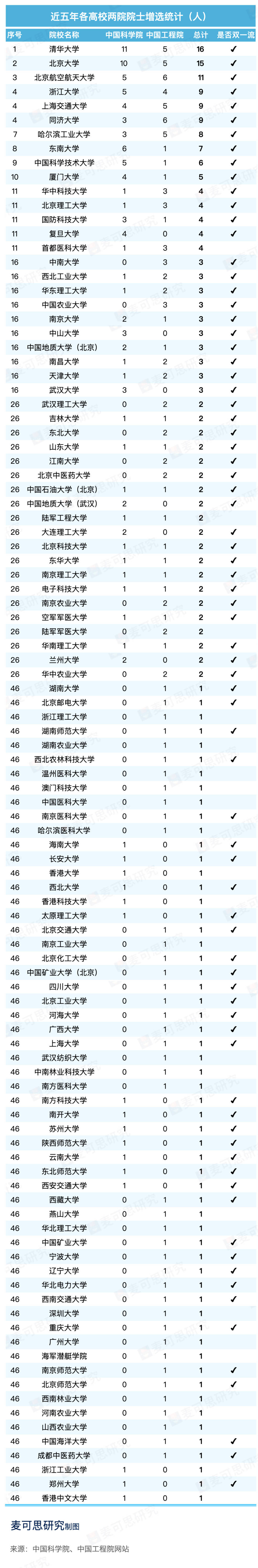 在近五年的三次院士增选中,清华大学以增选11位中国科学院院士、5位中国工程院院士,共计16位两院院士位列第一。北京大学以一人之差位列第二。北京航空航天大学以5位中国科学院院士、6位中国工程院院士,共计11位两院院士位列第三。浙江大学、上海交通大学和同济大学均新增9位两院院士,并列第四。哈尔滨工业大学新增8名两院院士,位列第五。