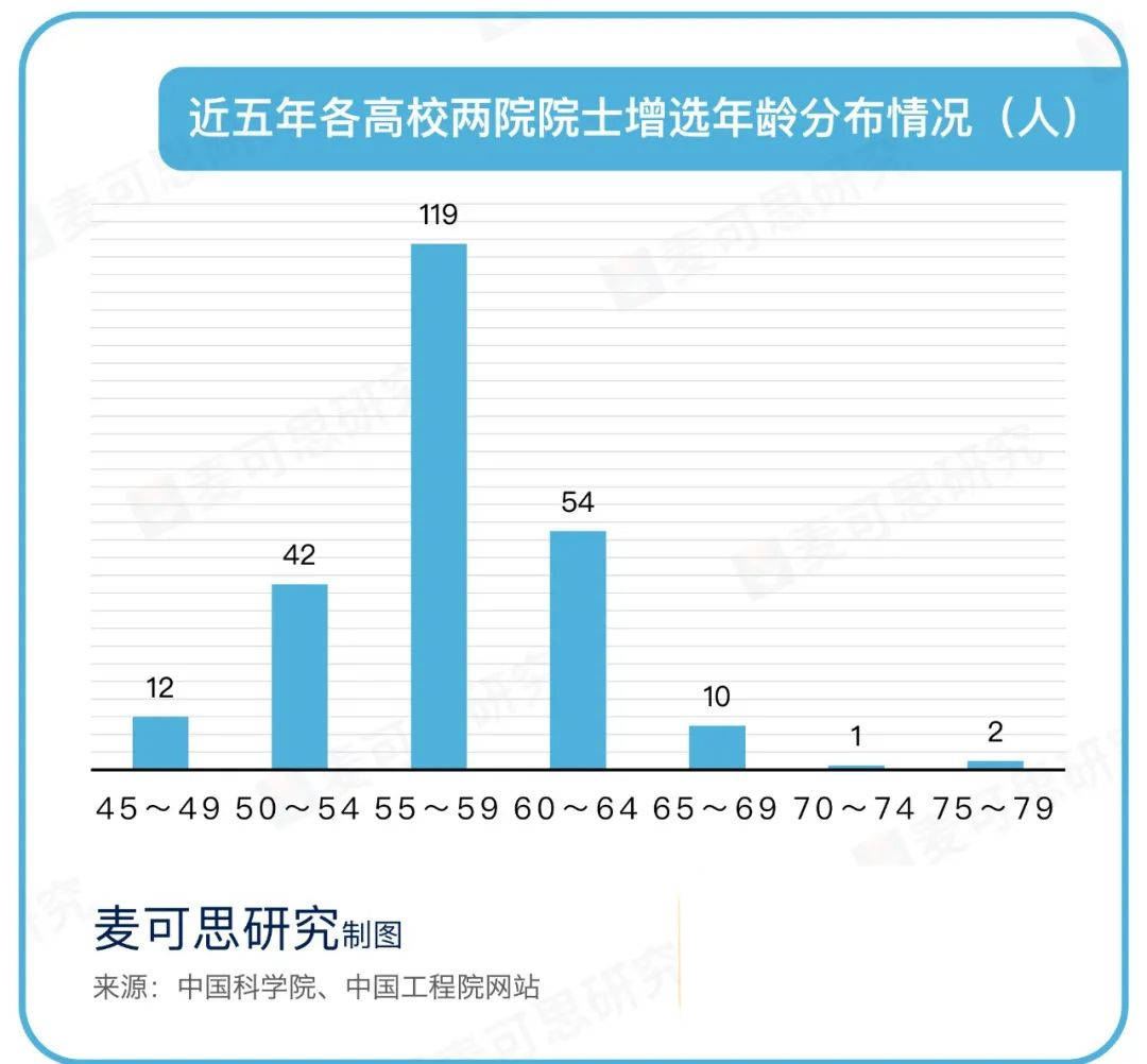 近五年两院院士被增选时的平均年龄约为57岁,其中,以55~59岁的院士人数最多,五年共有119位两院院士在这个年龄段中被增选。其次是60~64岁以及50~54岁,分别有54人和42人被增选。