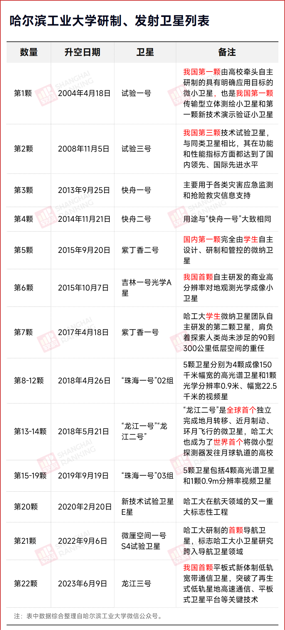 从神舟到嫦娥,从长征到天宫,中国载人航天的每一步,都有哈工大教师和技术人员的身影,使哈工大成为国内获得中国载人航天工程突出贡献集体的唯一高校;中国第一颗由高校牵头自主研制的小卫星、第一颗由高校学子自主设计研制管控的纳卫星、令哈工大成为世界首个将微小型探测器发往月球轨道的高校的“龙江二号”……校史上成功发射的22颗卫星,镌刻着哈工大的举世无双。
