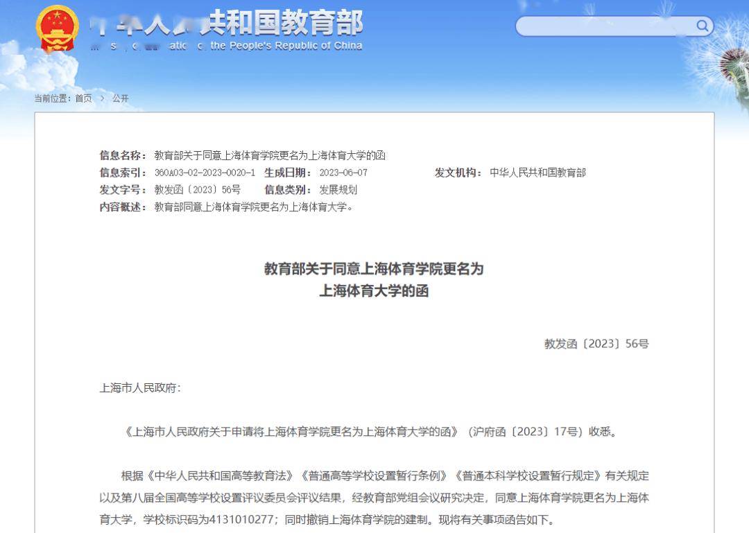 此前,2023年6月,教育部发布同意上海体育学院更名为上海体育学院的函,同意上海体育学院更名为上海体育学院。