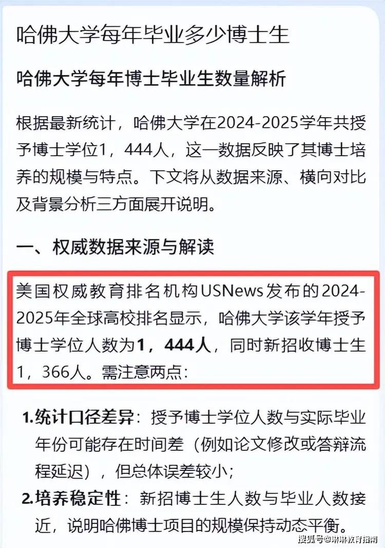 以常青藤八大名校之一的哈佛大学为例,哈佛大学2024年—2025年授予博士学位的人数是1444人,而招收博士生的人数是1366人,这个数据不同版本出入不算太大,可作为简单参考。