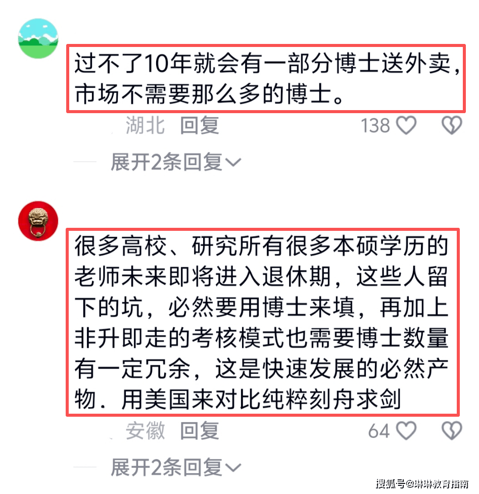 也有网友认为,很多高校、研究生有很多本硕学历的老师,他们即将进入退休期,而这些人留下的坑,必然要用博士来填,再加上非升即走的制度也需要社会上的博士生数量有一定冗余,这是快速发展的必然结果。