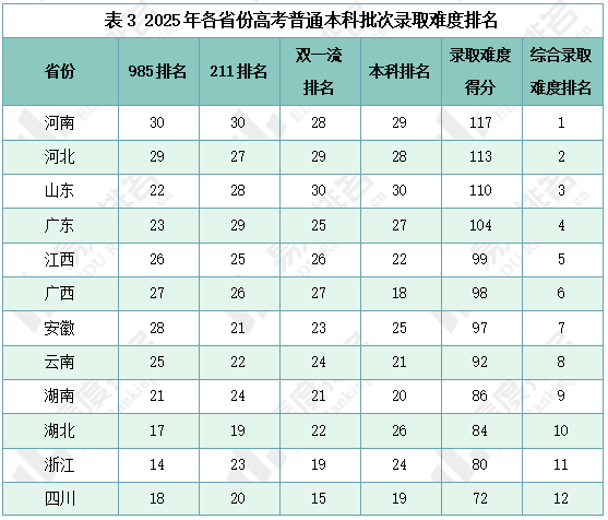 2025年高考综合录取难度榜单显示,河南、河北、山东、广东等人口大省构成了中国高考竞争最激烈的“第一梯队”,综合难度得分均超过100分。其中,河南在985、211录取率上均排名全国末位,总体得分(117分)高居榜首。