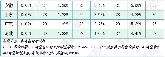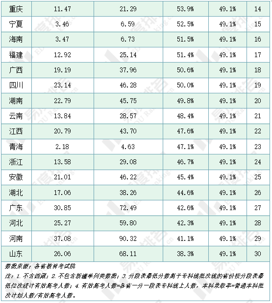 北京、上海本科录取率分别高达74.5%、73.6%,录取难度较低。今年两市招生和高考人数均有上升,当地考生相对其他省市考生面临的竞争压力较小。反之,山东、河南的本科录取率仅为38.3%、41.1%,在全国排名垫底。山东拥有超过68万的有效高考人数,却只有约26万左右的本科计划数,竞争强度居高。