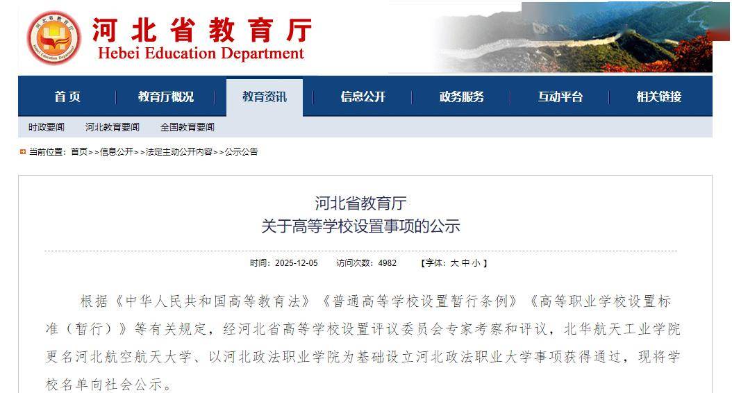 12月5日,河北省教育厅发布关于高等学校设置事项的公示,提出将北华航天工业学院更名为河北航空航天大学、以河北政法职业学院为基础设立河北政法职业大学。