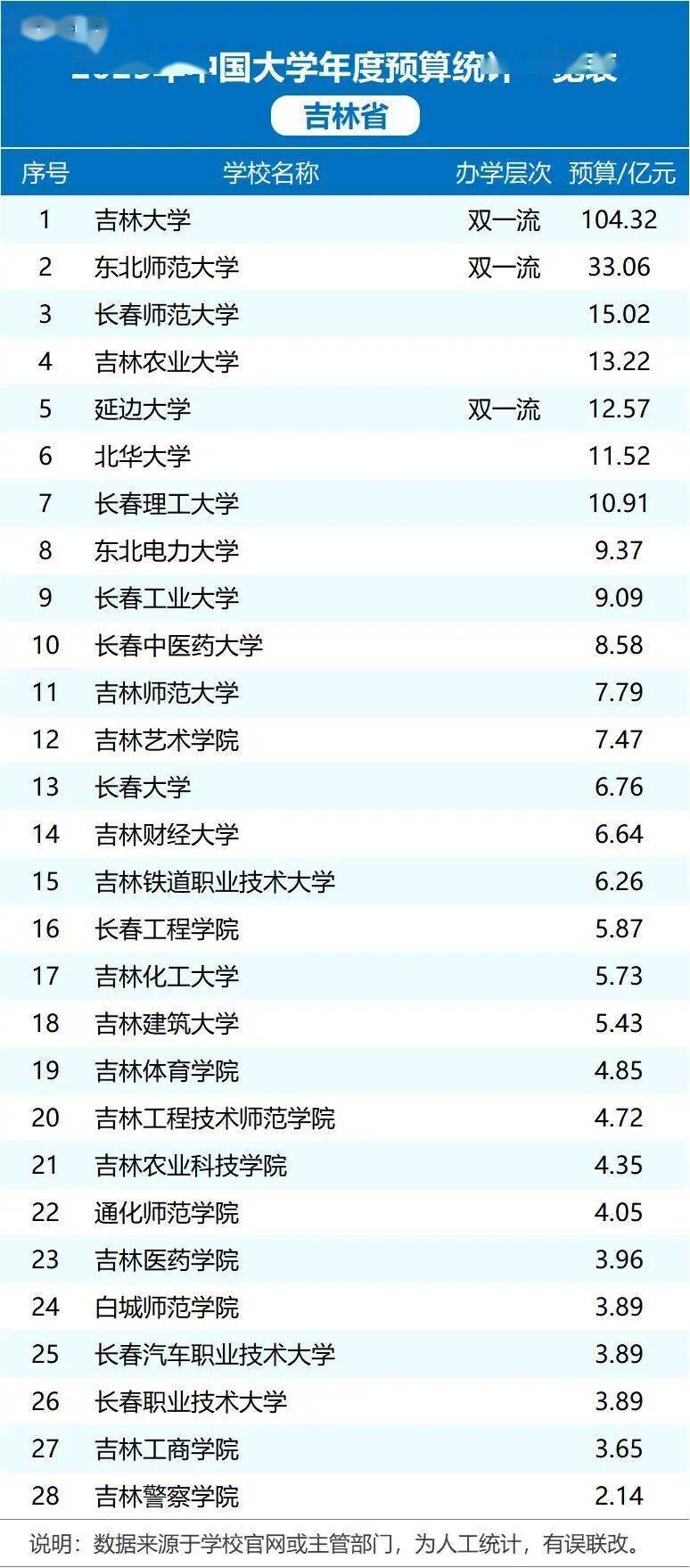 2025年中国大学年度预算统计显示,吉林省高等教育蓬勃发展,整体实力显著提升。吉林大学以104.32亿元高居榜首,彰显其双一流建设核心地位;东北师范大学以33.06亿元紧随其后,突出教育强校特色;长春大学以6.76亿元展现应用型高校潜力。其他高校如长春师范大学(15.02亿)、吉林农业大学(13.22亿)和延边大学(12.57亿)等预算均超10亿,共同推动区域创新与人才培养,为吉林省经济社会发展注入强劲动力。