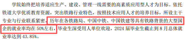 学校官方发布的就业数据显示,历年毕业生在各铁路局、中国中铁、中国铁建等具有铁路背景的大型国企就业率均在50%左右。