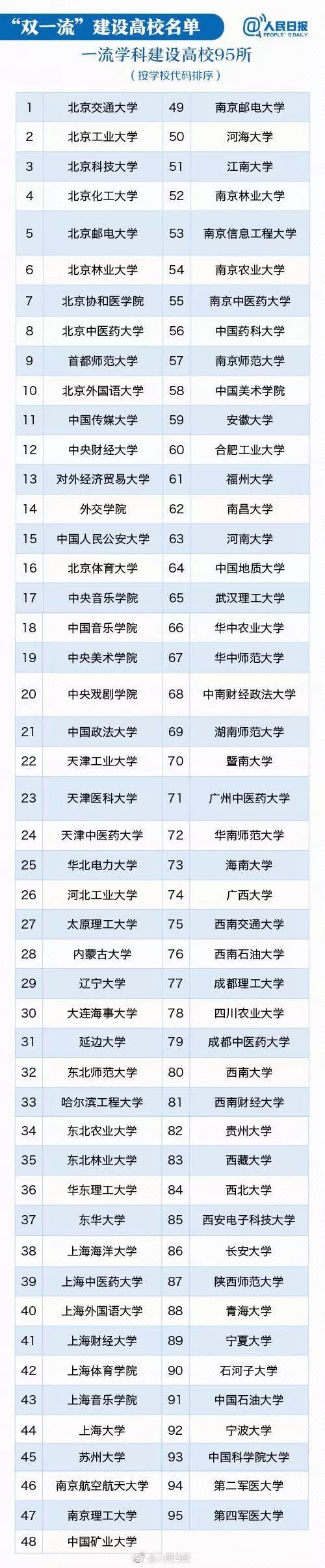 “一流学科建设高校”重在优势学科建设,促进特色发展,共计95所。除了之前的大部分“非985”211大学,主要增加的特色明显的高校: