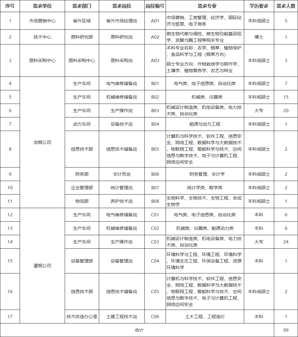 根据2021年福建省烟草公司发布的部分社会招聘情况来看,招聘岗位中仅部分岗位面向烟草专业毕业生,反倒是电气、机械、经贸类等专业的招聘人员更多。对于学历上的要求,仅生产操作岗最低是大专,其他大都要求本科或硕士,部分学历要求为博士。