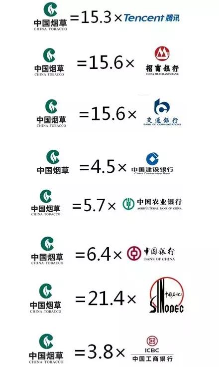 那么中国烟草缴纳的庞大税利数字与各大银行、中石化、腾讯等大头利润比较起来是一个怎样的概念呢?