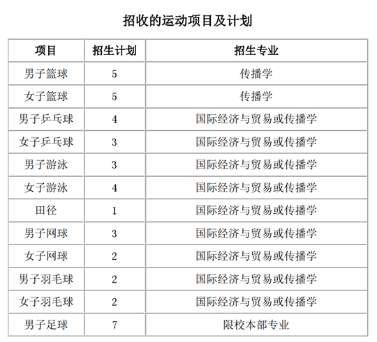羽毛球:一级及以上运动员考生,且在高中阶段获省级中学生比赛单打前两名,或全国中学生羽毛球比赛分站赛单打前两名或总决赛单打前四名;不接受15岁(含,以出生年月日为准)以后在国家体育总局或中国羽毛球协会注册过的运动员、有国际羽联排名的运动员以及在入学前代表省、自治区、直辖市、特别行政区、市、俱乐部、行业体协、企业或以个人身份参加(报名)下列比赛之一的运动员报名: