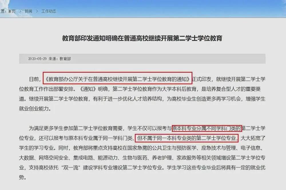 2020年5月29日,教育部明确《在普通高等院校继续开展第二学士学位教育的通知》。