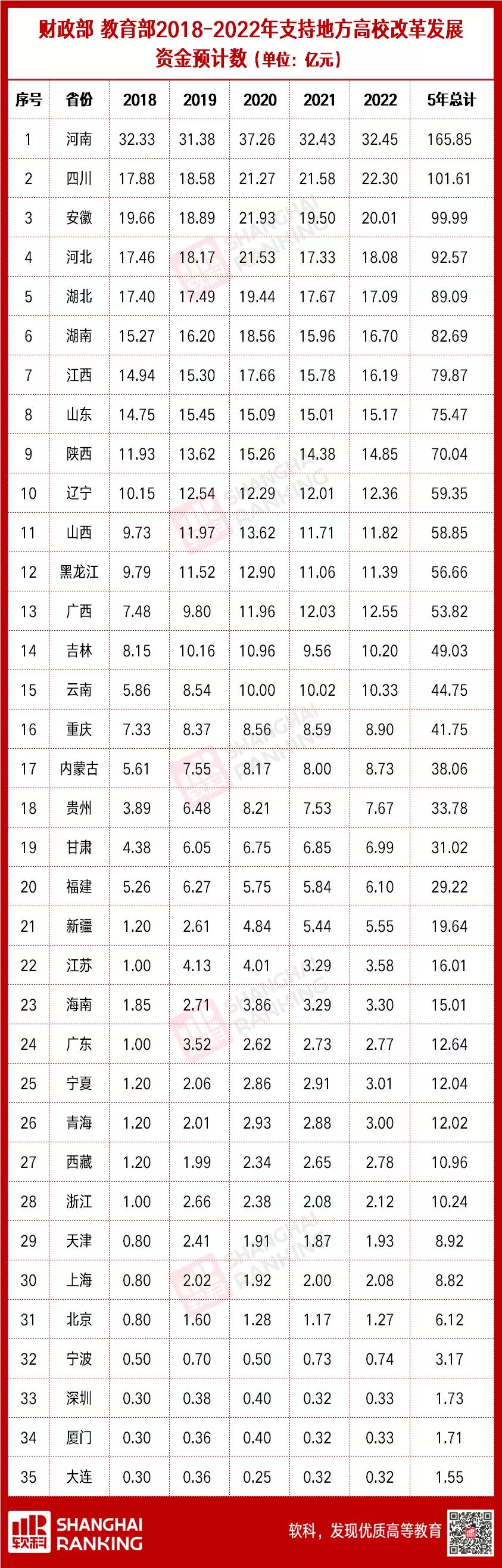 2018年-2022年,财政部 教育部联合下达的支持地方高校改革发展资金预计数中,河南获得的资金数连年稳居第一,5年累计166亿地方高校改革发展资金,超过35省市5年总预算的十分之一,力度之大,可想而知;四川作为西部高等教育重镇,5年也累计获得超过100亿资金预算;安徽、河北、江西、陕西、山西、广西等中西部省份均获得50亿以上。