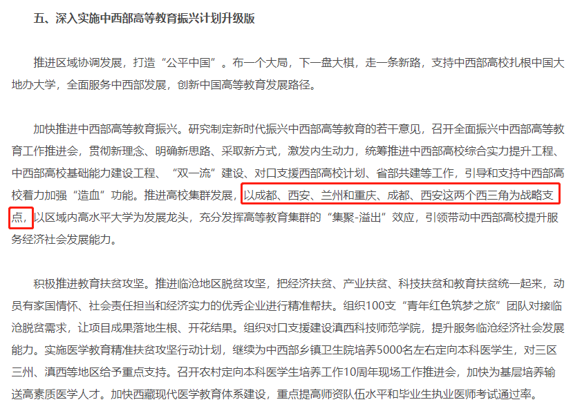 早在《教育部高等教育司2019年工作要点》中就提及——以成都、西安、兰州和重庆、成都、西安这两个西三角为战略支点。在2020年8月举行的新时代中国高等教育发展与改革高峰论坛上,教育部再次提到,将推出两个“西三角”高等教育战略支撑点,要把每所高校点的发展变成紧紧地结合国家主体功能区的集群发展。