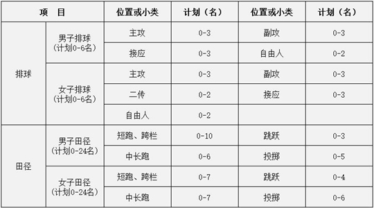 注:1.田径项目不招马拉松、全能、竞走类、撑杆跳高和链球。2.招生计划省份:全国除港、澳、台和上海以外的省(市、区)。