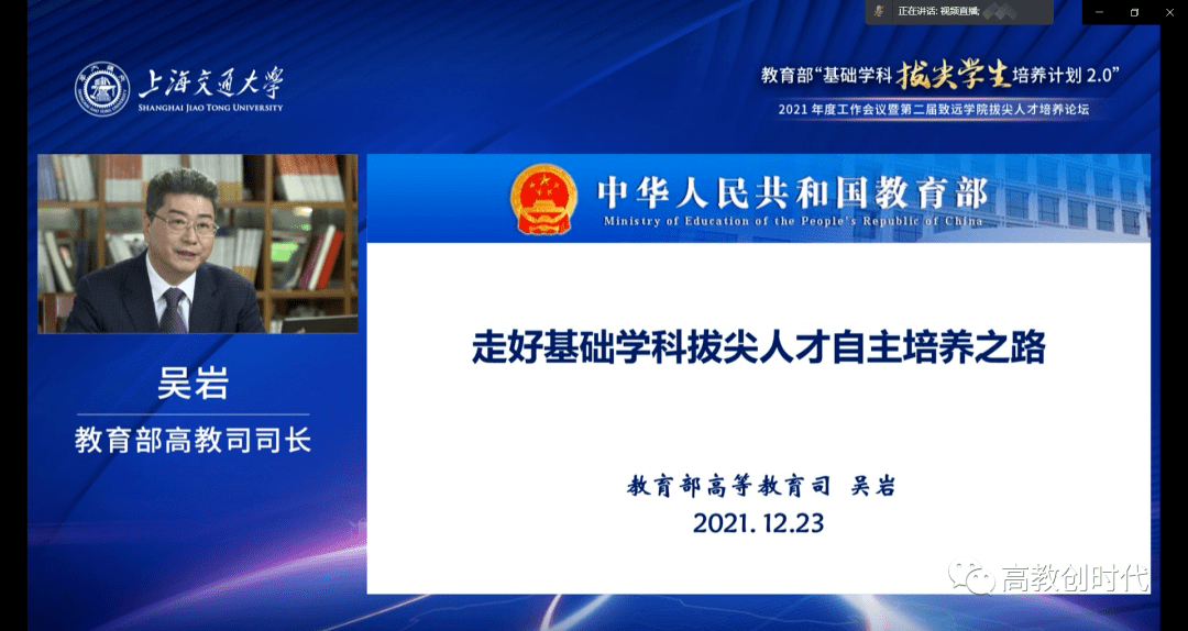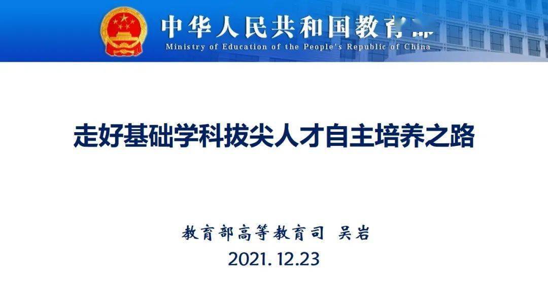12月23日上午,教育部高教司司长吴岩线上出席2021年度基础学科拔尖学生培养计划2.0工作推进会并作《走好基础学科拔尖人才自主培养之路》的精彩报告。