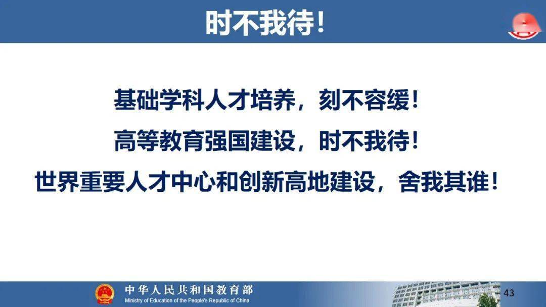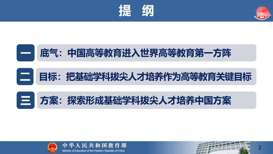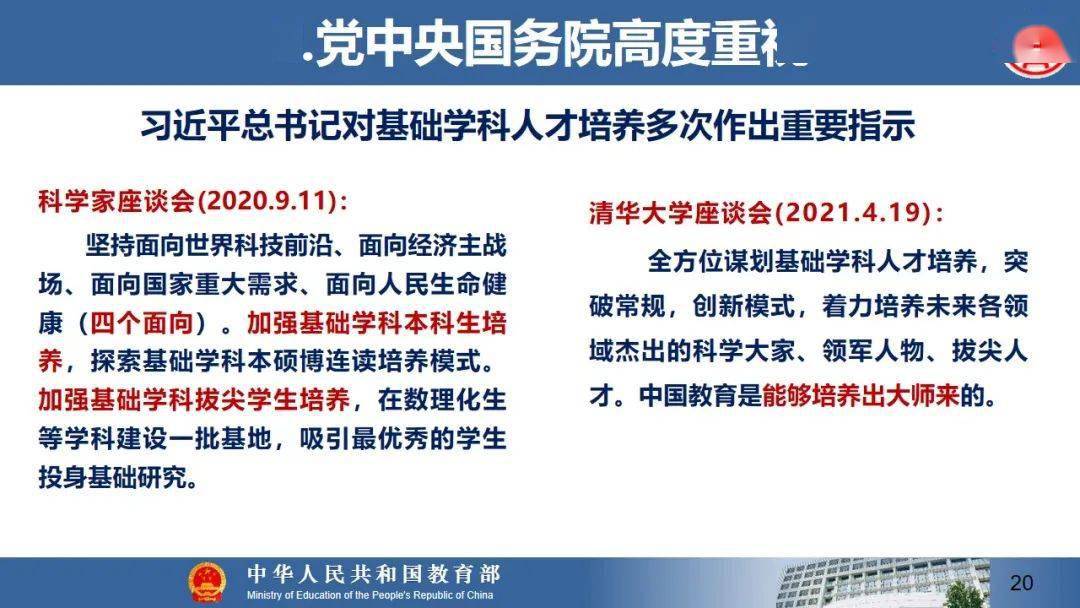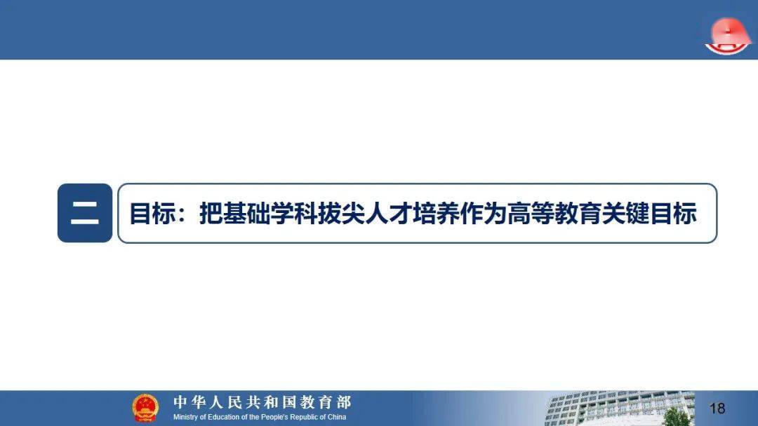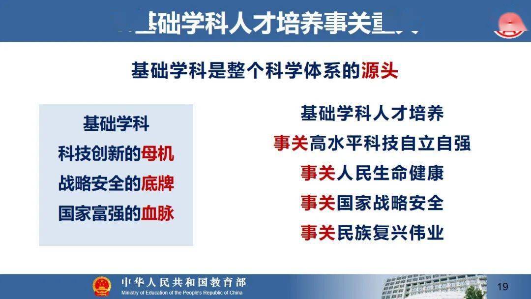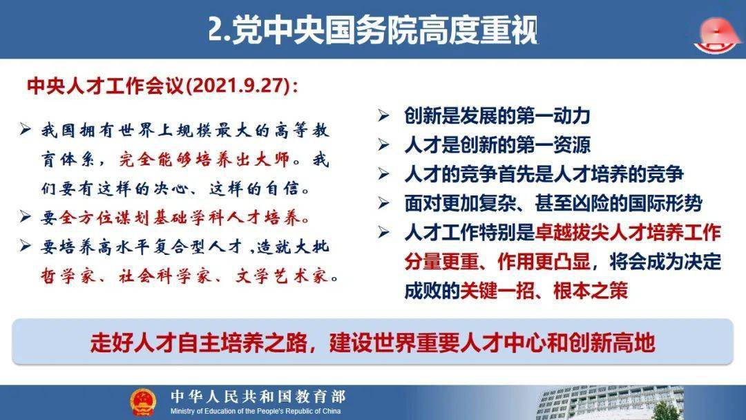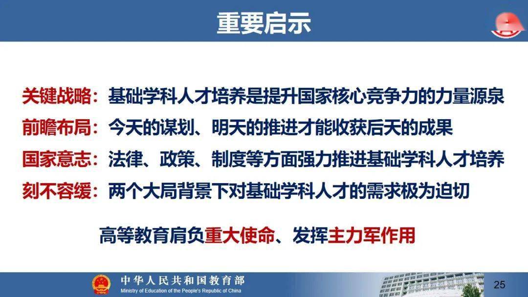 二是“目标”,从党中央国务院高度重视、发达国家加强部署等方面分析形势任务,提出高等教育要肩负重大使命、发挥主力军作用,要把基础学科人才培养作为关键目标。