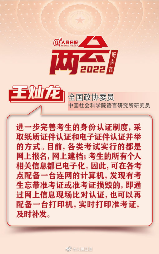 中国社会科学院语言研究所研究员王灿龙委员建议:进一步完善考生的身份认证制度,采取纸质证件认证和电子证件认证并举的方式。