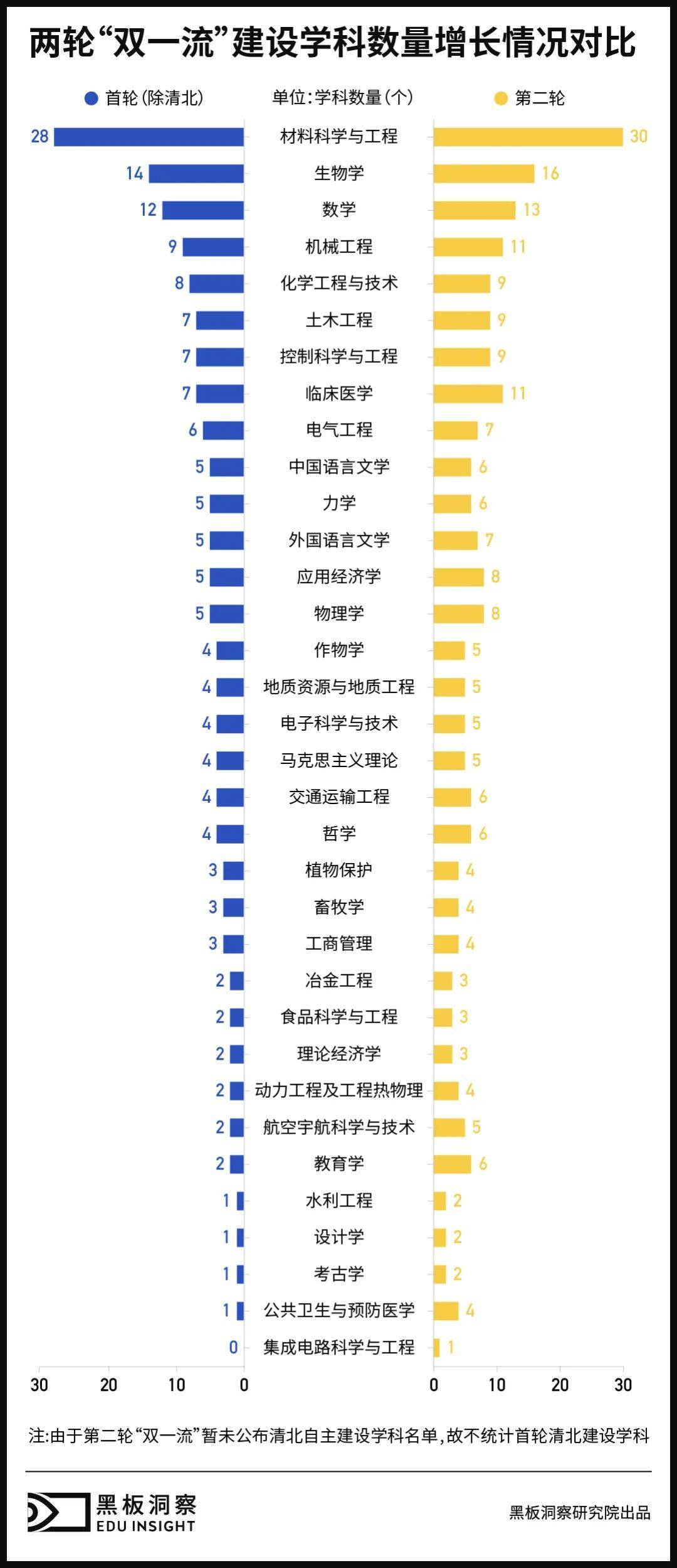 首轮“双一流”建设学科有 108 门,第二轮“双一流”目前公布的建设学科有 97 门。现代语言学、机械及航空航天和制造工程、商业与管理、电子电器工程、艺术与设计等 12 门学科暂未出现在建设名单当中。不过首轮建设名单中就有 4 门学科,仅清北参与建设,所以也不排除清北两所高校后续是否会扩展建设学科门类。但就目前而言,建设学科门类的小幅度缩减,或许能够代表在历经五年之后,教育部等部门对高等教育强国发展的进一步思考和重点发力。