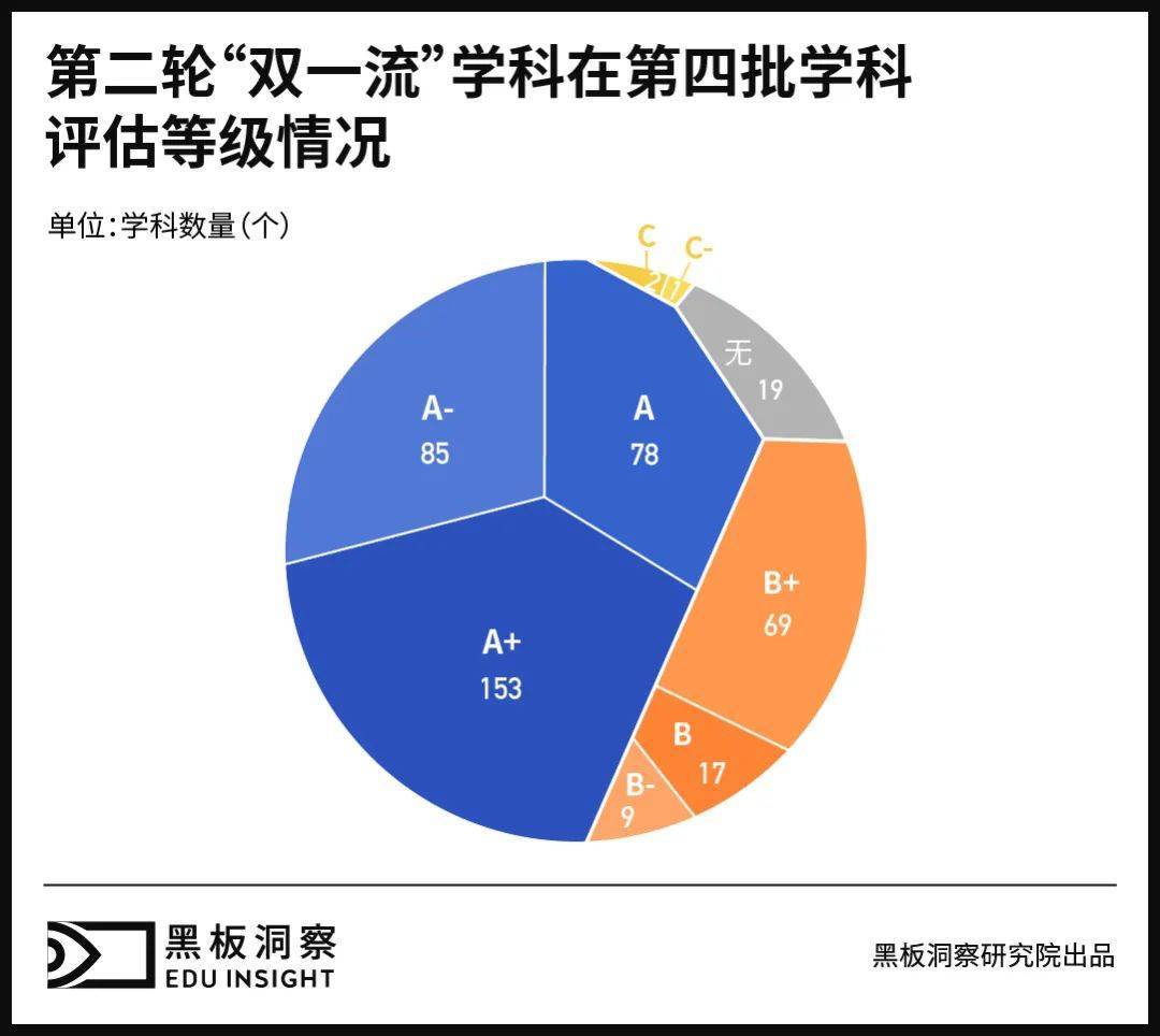 学位中心相关负责人曾表示,学科评估结果能够体现学科建设水平的实际变化,满足社会对教育质量的知情需求,有利于引导高校将注意力转移到学科内涵建设的优势和不足中去。将第二轮“双一流”建设学科名单与全国第四轮学科评估结果进行比对,我们发现,超 1/3 的学科被评为 A+,超 72% 的学科评估等级在 A- 及以上。学科评估等级与是否能够入围“双一流”似有一定关系,但也不尽然。
