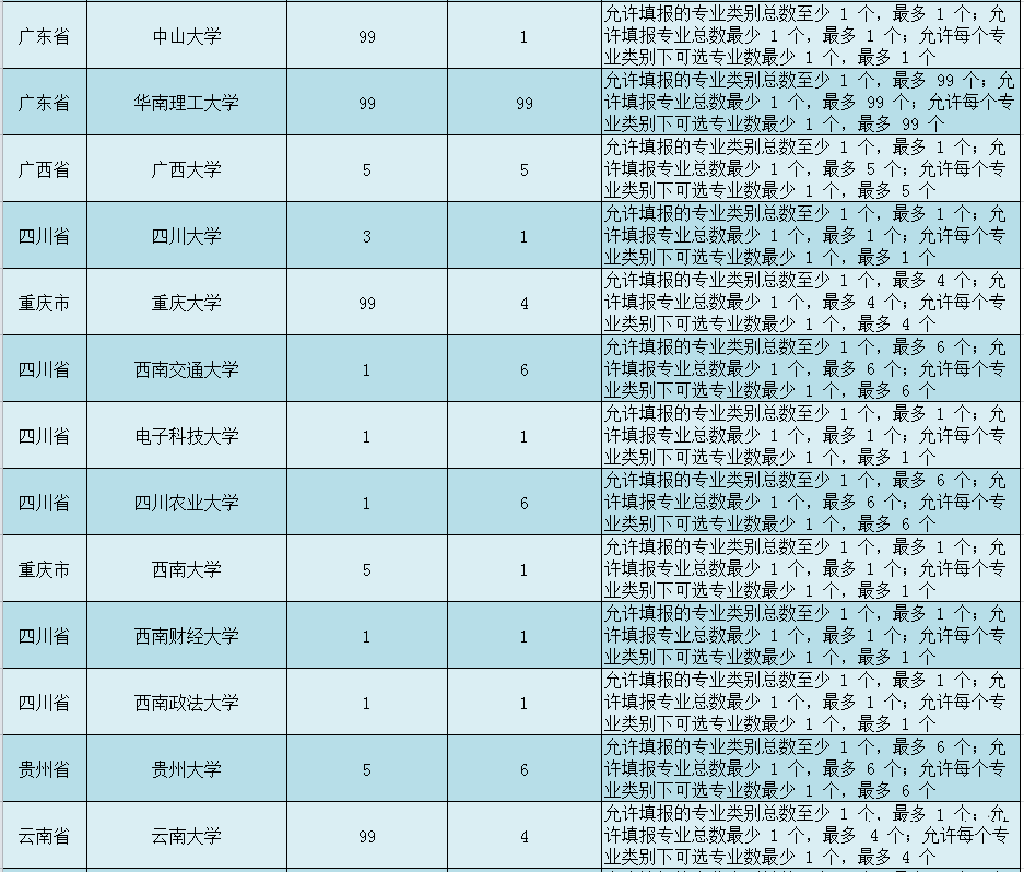 但值得注意的是,西南交通大学、电子科技大学、四川农业大学、西南大学、西南财经大学、西南政法大学几所高校限报1所,需谨慎报考!