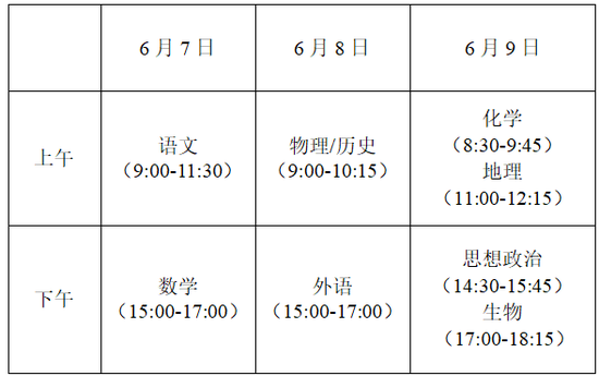 高考和等级性考试于6月7日开始举行。具体科目考试时间安排为:6月7日9:00至11:30语文;15:00至17:00数学。6月8日15:00至17:00外语(英语笔试15:00至16:40)。6月9日8:30至9:30物理;11:00至12:00思想政治;15:00至16:00化学。6月10日8:30至9:30历史;11:00至12:00生物学;15:00至16:00地理。