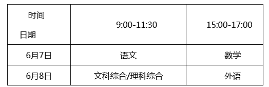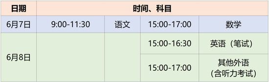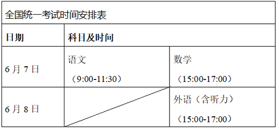 (1)全国统一考试。全国统一考试科目考试时间安排在6月7日全天和6月8日下午,其中语文考试时长为150分钟,数学、外语考试时长均为120分钟。