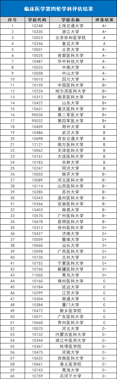 全国第四轮临床医学学科评估结果如下: