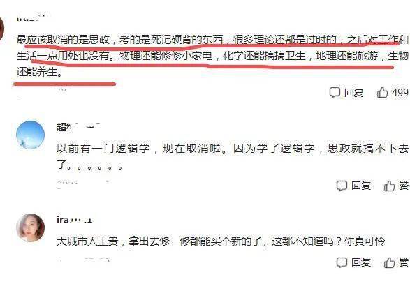 一些网友认为最应该取消的是“思政”,死记硬背太难受,一些理论也过时了,工作和生活照样用不到,不像理科知识,日常总是能用到。