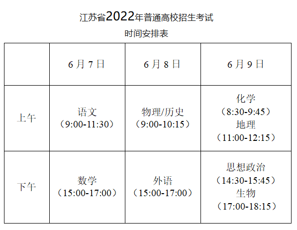 经教育部批准,我省全国统考科目、学业水平选择性考试科目考试时间为6月7、8、9日。具体如下图所示: