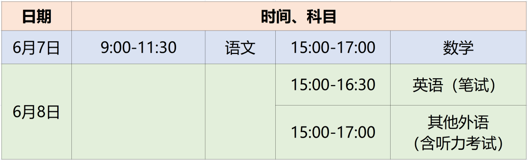 国家统一高考科目使用全国统一命题试卷,考试时间安排在6月7日全天和6月8日下午,其中语文考试时间为150分钟,数学考试时间为120分钟,外语(笔试)考试时间为100分钟。外语(听力)考试安排在1月8日上午,连续组织两次,每次考试时长约20分钟,考试成绩取两次中的高分计入外语科目成绩。